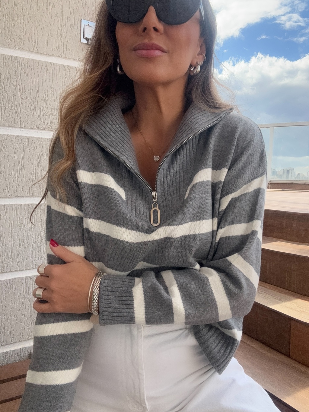 Detalhes / Modelagem: lindo tricot com zíper listrado com modelagem reta