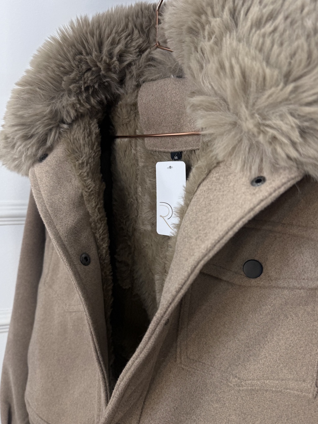 Detalhes / Modelagem: jaqueta em lã batida com modelagem mais curta toda forrada e peluciada por dentro na parte do tronco. Gola com pelos removíveis e bolsos funcionais. Dani usa tamanho M.